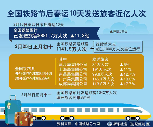 2月28日,全国铁路发送旅客983.8万人次,增开旅客列车832列,旅客发送量同比增加112.7万人次,增长12.9%。节后春运全国铁路客流始终处于高位运行,节后13天以来,全国铁路日均发送旅客近千万,达到997.9万人次,同比增加105.9万人次,增长11.9%。武汉局集团公司当日发送旅客67.3万人次,同比增长5.9%;上海局集团公司发送旅客171.8万人次,同比增长13.6%;南昌局集团公司发送旅客79.2万人次,同比增长7.1%;广州局集团公司发送旅客122.9万人次,同比增长9.5%;成都局集团公司发送旅客101.7万人次,同比增长12.6%。