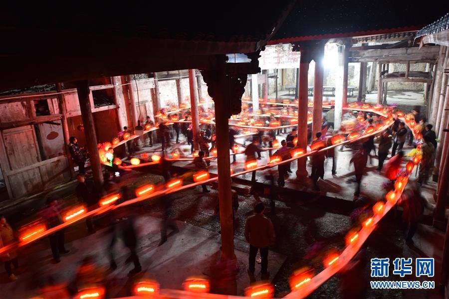3月2日晚,在浙江省磐安县冷水镇箬坑村,村民舞动上百米长的板凳龙灯,欢度元宵节。新华社发(孔德宾 摄)