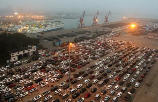 ▲ 2月22日,汽车在海口市秀英港港区内排队等待出岛。新华社记者赵颖全摄