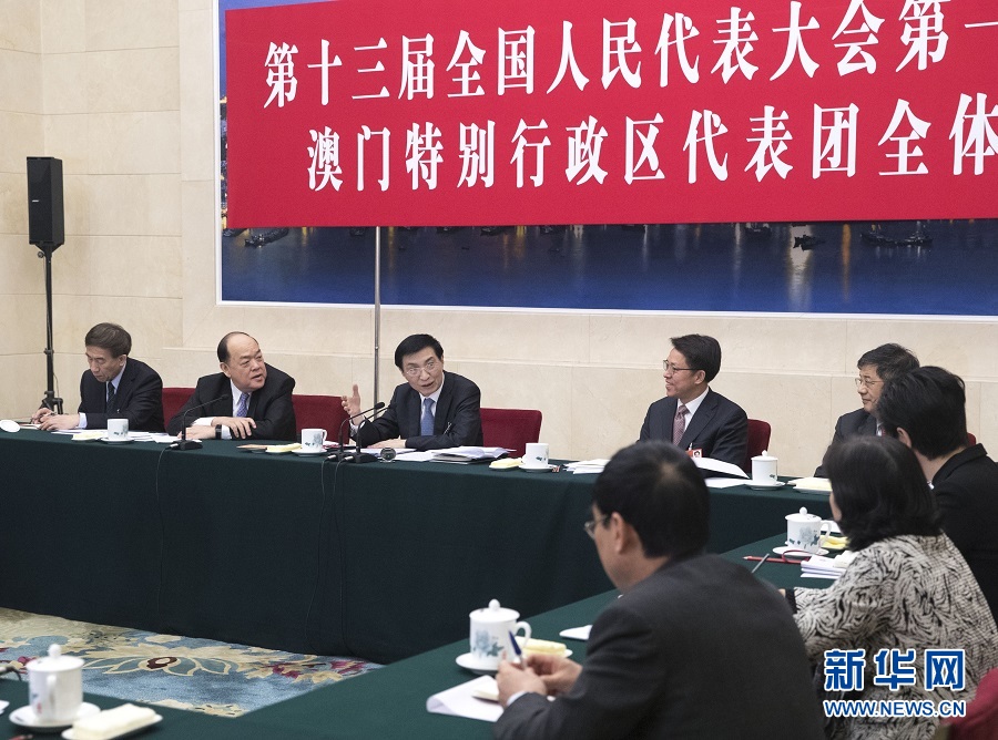 3月6日,中共中央政治局常委、中央书记处书记王沪宁参加十三届全国人大一次会议澳门代表团的审议。 新华社记者王晔摄