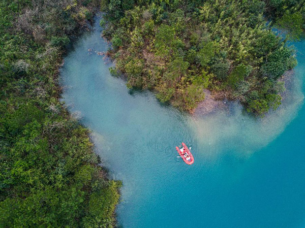 浙江湖州市吴兴区妙西镇专职巡护员乘船清理霞幕山水库的漂浮物(2017年3月29日摄)。建设生态文明是中华民族永续发展的千年大计。一个天蓝、地净、水清的美丽中国,是全国人民的共同期盼。五年来,我国生态环境状况明显好转,推进生态文明建设决心之大、力度之大、成效之大前所未有,大气、水、土壤污染防治行动成效明显。美丽中国建设正在谱写出新篇章。新华社记者徐昱摄