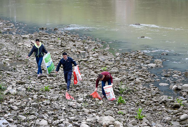 福建省漳平市南洋镇党委书记、双洋溪河段长李达才(中)与村干部清理溪内垃圾(2017年3月15日摄)。2016年底,中共中央办公厅、国务院办公厅印发《关于全面推行河长制的意见》,并成为2017年政府工作报告中的一项重要内容。河长制,迅速成为全社会关注的热点。新华社记者姜克红摄