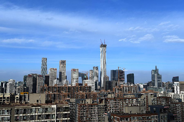 蓝天白云下的北京CBD(2018年1月22日摄)。2017年北京空气质量优良天数226天,比2013年增加50天;重污染日23天,比2013年减少35天。新华社记者罗晓光摄