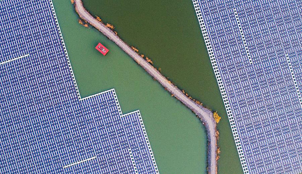安徽省宿州市埇桥区朱仙庄矿区采煤坍陷区水域光伏发电项目已经安装完成的部分(2017年12月6日摄)。新华社记者郭晨摄
