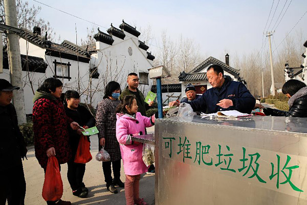 在江苏沛县安庄村,垃圾分类收集员在收集各家的可堆肥垃圾,并进行称重和记录,给予积分(2018年2月14日摄)。新华社发(胡传松摄)