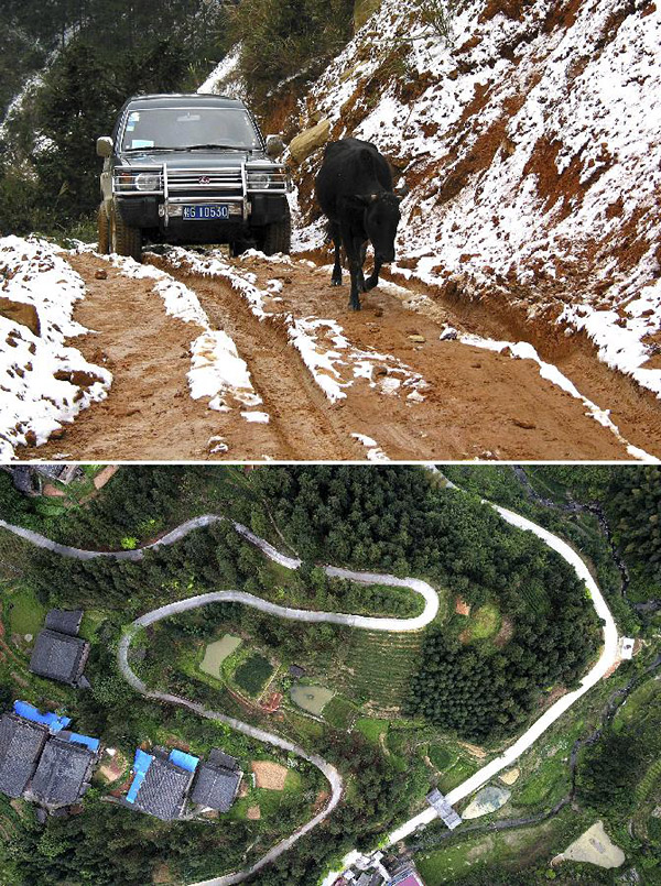 这是一张拼版图片。上图:2002年12月27日,一辆汽车跟在一头牛身后行驶在牙己村的泥泞山道上(刘广铭摄);下图:2017年4月16日航拍的牙己村屯水泥路(黎寒池 摄)。新华社发