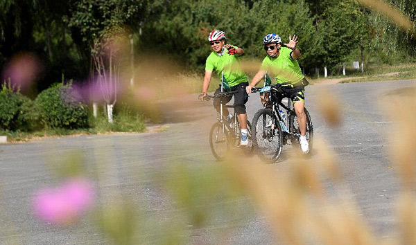 在河北固安县,骑友在无车日主题骑行活动上骑行(2017年9月22日摄)。新华社记者王晓摄