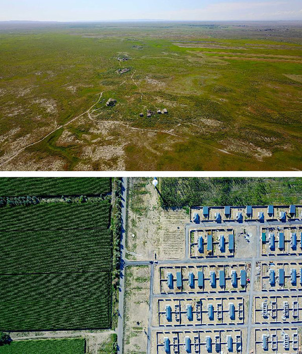 上图:这是在库鲁斯台草原腹地拍摄的牧民曾居住的房子;下图:这是在新疆裕民县阿勒腾也木勒乡江阿布拉克村拍摄的生态移民点(拼版照片,2017年7月20日摄)。新华社记者 胡虎虎 摄
