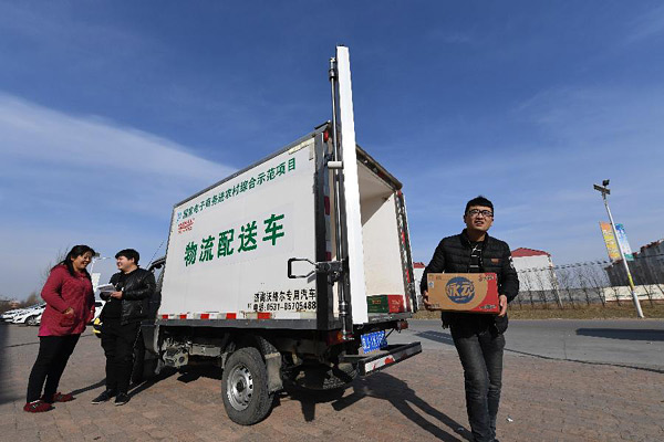 3月1日,河北省南皮县农村电商仓储物流配送中心的工作人员在给南皮县刘八里村电商服务站配送货物。近年来,河北省南皮县积极探索电商扶贫模式,已实现电商服务站行政村全覆盖。新华社记者牟宇摄
