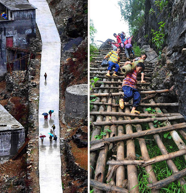 2012年9月3日,广西大化瑶族自治县板升乡弄勇村弄顶屯的孩子们扛着生活用具去学校(右图);2017年1月11日,水泥公路已经从学校修通到家门口(左图)。随着脱贫攻坚工作不断推进,原本“千重山,万层岭,不通水,不通电”的广西大石山区发生了翻天覆地的变化。新华社记者黄孝邦摄