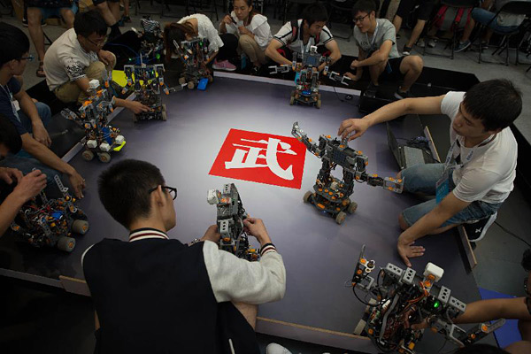 在北京亦创国际会展中心,参赛队员在调试格斗机器人(2017年8月23日摄)。新华社记者金立旺摄