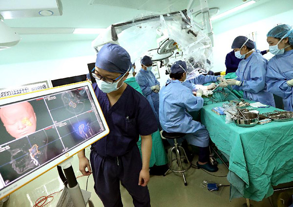 上海市浦南医院主刀医生在3D导航仪的帮助下实施颅内手术。3D导航仪可提高手术精准性,减少并发症,提升患者生存率(2017年4月8日摄)。新华社记者陈飞摄
