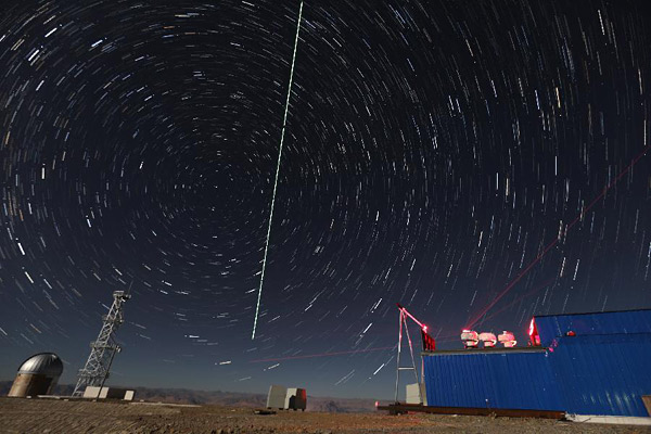 2016年12月10日,在西藏阿里观测站,“墨子号”量子科学实验卫星过境,科研人员在做实验(合成照片)。