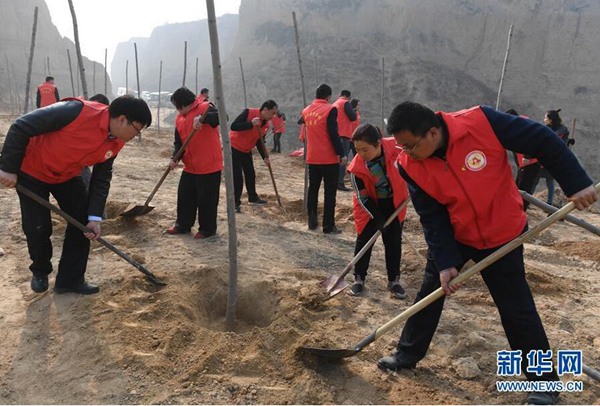 3月12日,山西省运城市稷山县学雷锋志愿者协会的志愿者们在荒山绿化点义务植树。 新华社发(栗卢建 摄)