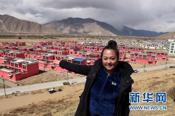 索朗央吉站在“四季吉祥村”前(3月6日摄)。新华社记者 觉果 摄