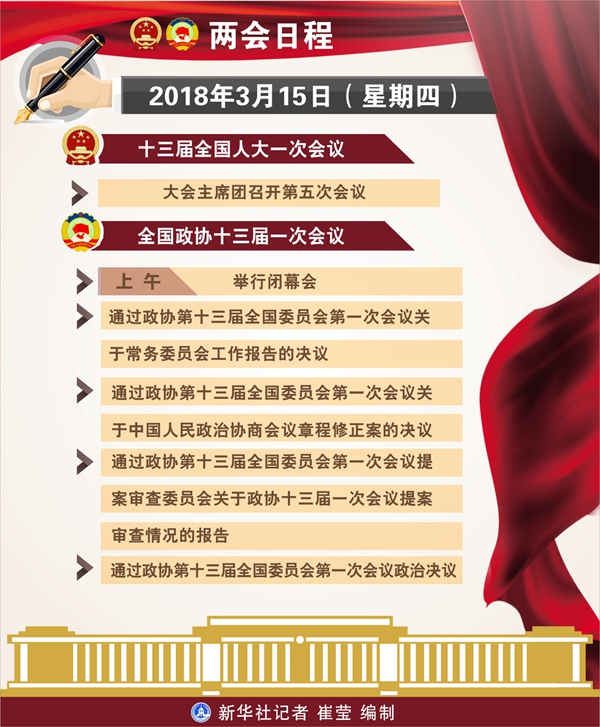 新华社北京3月14日电 全国政协十三届一次会议15日上午举行闭幕会,通过政协第十三届全国委员会第一次会议关于常务委员会工作报告的决议,通过政协第十三届全国委员会第一次会议关于中国人民政治协商会议章程修正案的决议,通过政协第十三届全国委员会第一次会议提案审查委员会关于政协十三届一次会议提案审查情况的报告,通过政协第十三届全国委员会第一次会议政治决议。