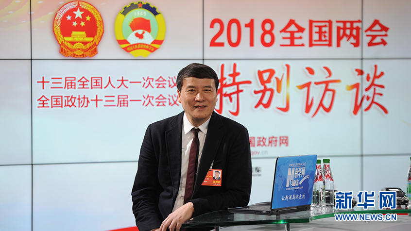 图为全国政协委员,中国文联副主席、中国美术学院院长许江做客新华网2018全国两会特别访谈。新华网 郭小天摄