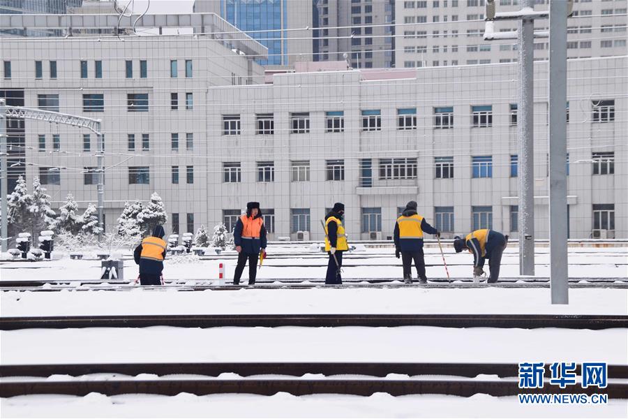 3月15日,沈阳北站的工作人员在清理铁轨上的积雪。当日,沈阳降落春雪。新华社发(龙雷摄)