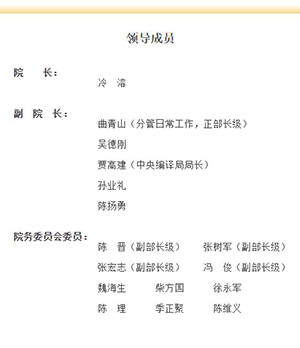 此外,担任副院长的有曲青山(分管日常工作,正部长级)、吴德刚、贾高建(中央编译局局长)、孙业礼、陈扬勇,院务委员会委员分别有陈晋(副部长级)、张树军(副部长级)、张宏志(副部长级)、冯俊(副部长级)、魏海生、柴方国、徐永军、陈理、季正聚、陈维义。