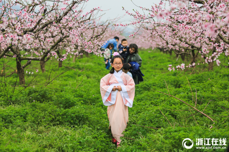 3月25日,身穿古装的小朋友在浙江省宁波市横溪镇生态农业园内游玩。