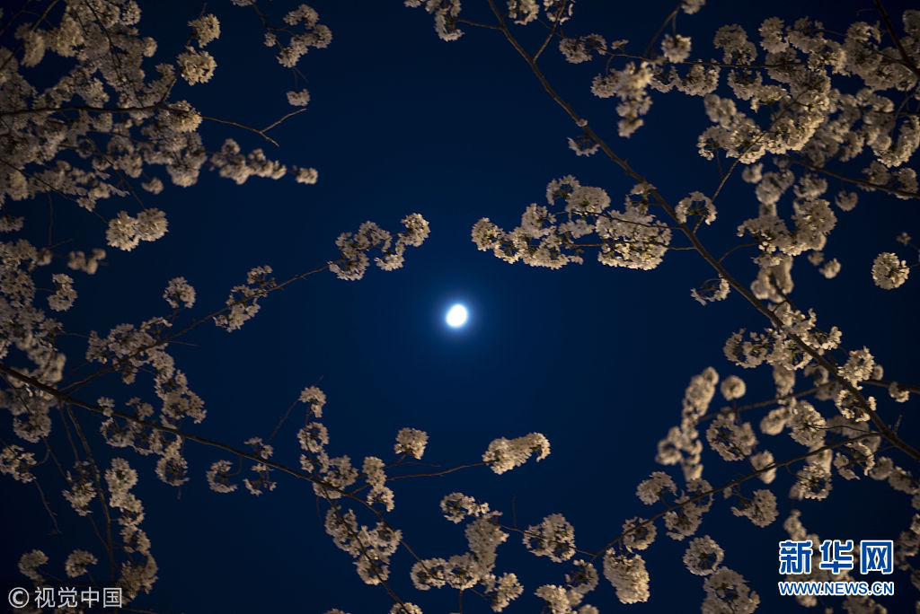 3月25日,扬州鉴真大道,夜幕下的樱花,在灯光月色的辉映下别有一番意境。(图片来源:视觉中国)