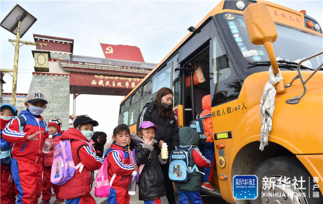 3月27日,克松村的孩子们登上校车出发去幼儿园。新华社记者 觉果 摄