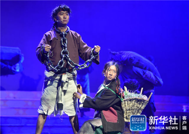 在西藏山南市乃东区,演员在根据真实历史改编的话剧《农奴泪》中演出(3月26日摄)。新华社记者 觉果 摄