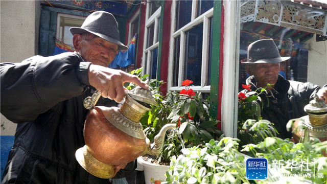 索朗顿珠在家中给花浇水(3月20日摄)。新华社记者 余刚 摄