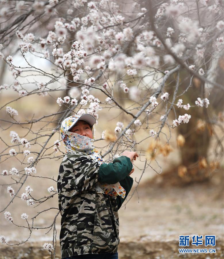 3月28日,农民在敦煌鸣沙山下的李广杏园内劳作。近日,甘肃省敦煌市鸣沙山下8000多亩李广杏花竞相开放,吸引了众多游客和市民踏青赏花。 新华社记者陈斌摄