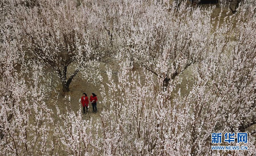 3月28日,游客在敦煌鸣沙山下的李广杏园内赏花。近日,甘肃省敦煌市鸣沙山下8000多亩李广杏花竞相开放,吸引了众多游客和市民踏青赏花。 新华社记者陈斌摄