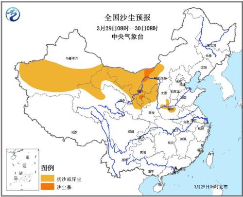 中央气象台3月29日06时继续发布沙尘暴蓝色预警,预计29日08时至30日08时,受大风影响,内蒙古中西部、宁夏大部、陕西北部、甘肃中西部、青海柴达木盆地、新疆南疆盆地等地部分地区有扬沙或浮尘天气。