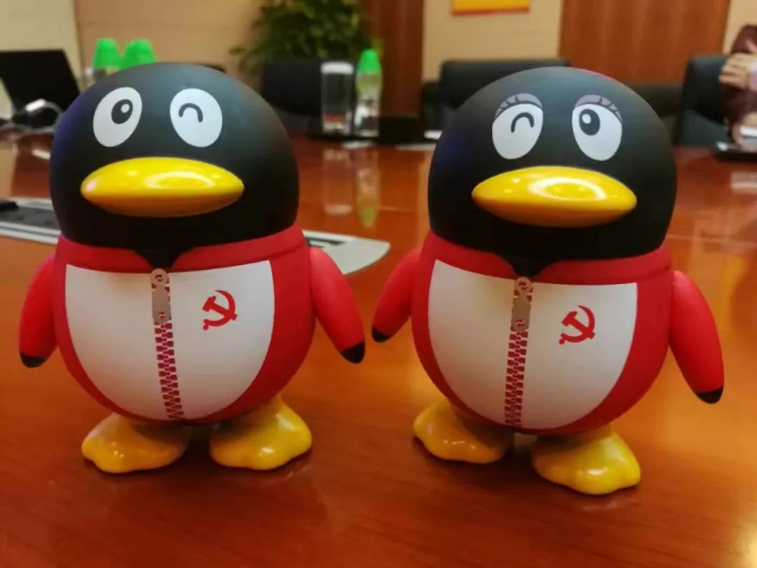 走进腾讯大楼,各式各样的企鹅公仔扑面而来,记者被一对穿着红白色外套、胸前戴着党徽的“Q哥”“Q妹”拖慢了脚步。