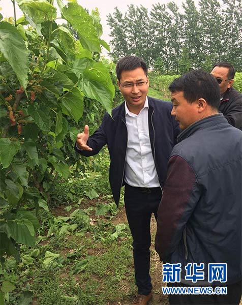 江苏宿迁市宿城区埠子镇蚕桑村党支部书记周炳均(左)带着村组干部、党员和种植大户30余人在徐州参观果桑种植等项目(2017年5月4日摄)。新华社发