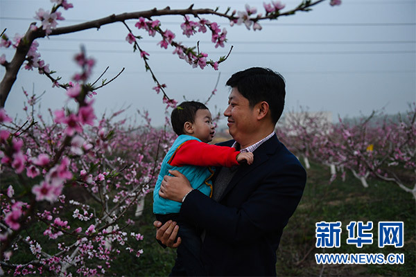 在泗阳县南刘集乡赵陈村“桃花源记”项目桃林前,市民带着孩子赏花(3月31日摄)。新华社记者 季春鹏 摄