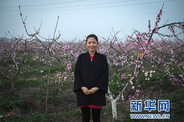 宋姗姗在泗阳县南刘集乡赵陈村“桃花源记”项目桃林前留影(3月31日摄)。新华社记者 季春鹏 摄