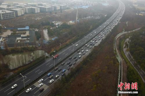 资料图:2月21日,大批车辆由北向南缓慢行驶在南京二桥高速公路上,绵延数公里。 中新社记者 泱波 摄
