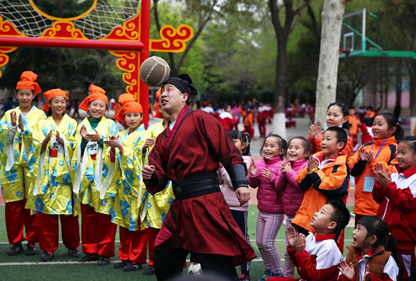 4月3日,在山东省淄博市临淄区金茵小学,教练向学生们展示蹴鞠技艺。蹴鞠是古时清明节的重要民俗活动之一,已有两千多年的历史。清明节前夕,世界足球起源地山东临淄的学生们在校园内开展蹴鞠运动,感受传统文化的魅力。