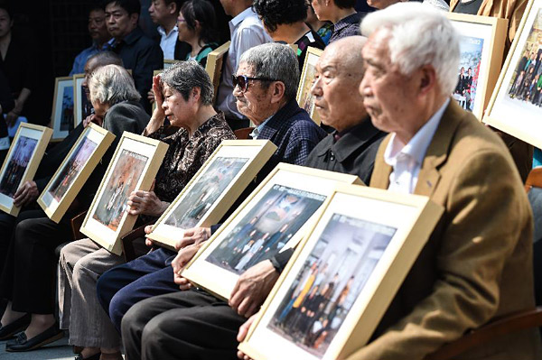 4月3日,南京大屠杀幸存者高如琴(前排右四)、马庭禄(前排右三)、傅兆增(前排右二)等与部分幸存者家属代表在开幕式上展示家族合影。当日,《重生·繁衍——南京大屠杀幸存者家族影像展》在侵华日军南京大屠杀遇难同胞纪念馆开幕,展出30位幸存者家族合影照、个人肖像照等。