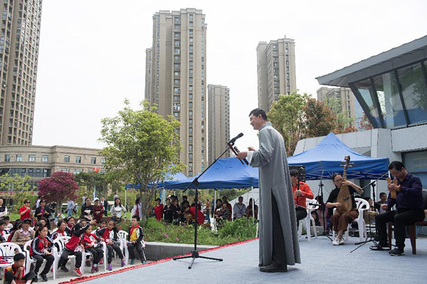 4月3日,小学生在绍兴市上虞区曹娥江畔的非遗展示馆观看绍兴莲花落的表演。当日,浙江省绍兴市上虞区打造的曹娥江畔文化惠民项目集体开门亮相,非遗展示馆、围棋与越剧大师工作室、娥江书场等7个场馆为群众免费提供听书看戏、阅读观影、琴棋书画、文艺沙龙等活动,所有文化服务经费均由政府买单,让文化设施成为实实在在的群众文化客厅。