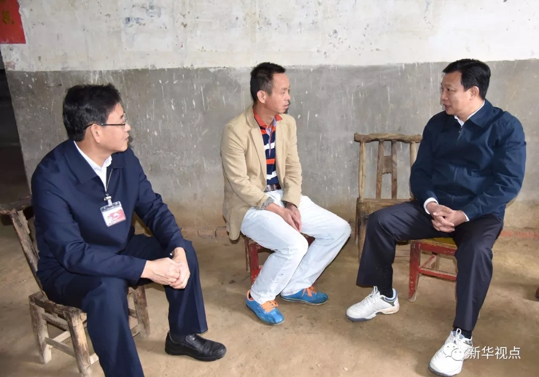 杨汉军(右)在武汉市新洲区调研精准扶贫和灾后重建工作(2016年10月14日摄)。