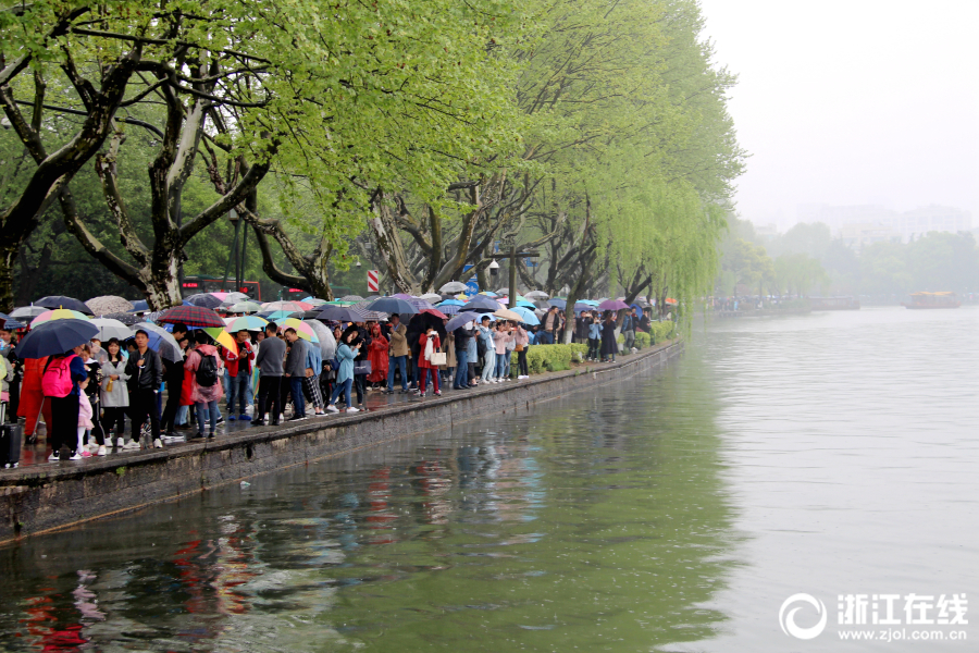 4月5日,清明小长假首日,杭州细雨绵绵,西湖景区游客络绎不绝。杭城虽降雨降温,但西湖景区前来赏花踏青的游客如潮,断桥似人桥。(浙江在线拍友 里尔 柱子 摄)