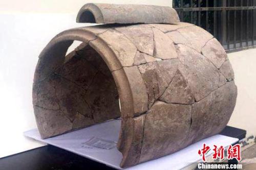 资料图:2017年,考古人员在位于西安的栎阳遗址发现一件战国时期的筒瓦,被确认为目前中国已知体量最大的古代筒瓦。图为出土的巨型筒瓦和普通陶瓦。阿房宫与上林苑考古队供图