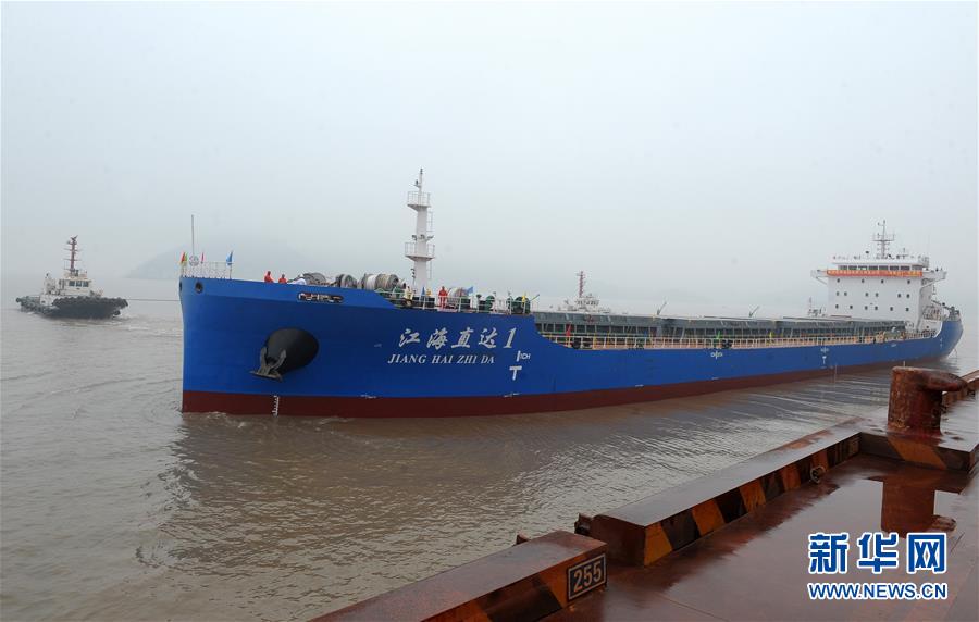 4月5日下午,“江海直达1”号在拖船的协助下驶离浙江省舟山市鼠浪湖矿石中转码头,首航安徽马鞍山。新华社发(吴琳红 摄)