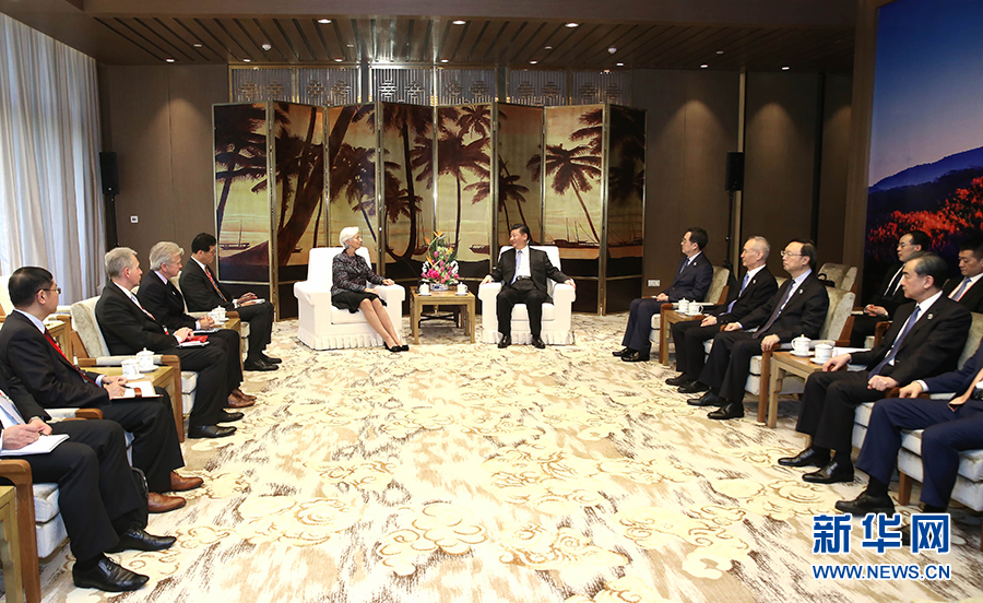 4月10日,国家主席习近平在海南省博鳌国宾馆会见国际货币基金组织总裁拉加德。 新华社记者 李涛 摄