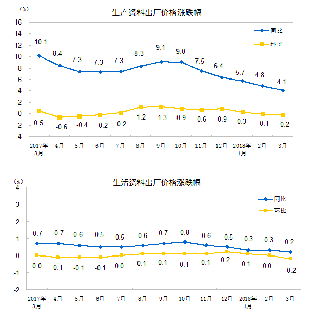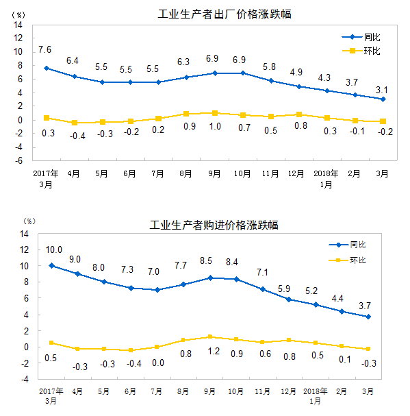 2018年3月份,全国工业生产者出厂价格同比上涨3.1%,环比下降0.2%。工业生产者购进价格同比上涨3.7%,环比下降0.3%。一季度,工业生产者出厂价格同比上涨3.7%,工业生产者购进价格同比上涨4.4%。