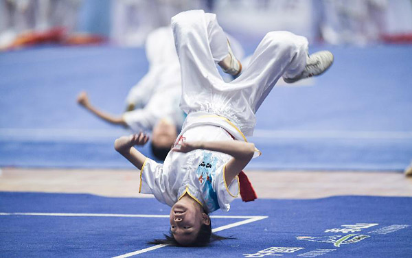 4月10日,演员们在开赛前表演节目。当日,2018年全国武术套路冠军赛(传统项目赛区)在四川省成都市大邑县体育馆开赛,本次赛事共有来自全国54支代表队的864名选手参赛。