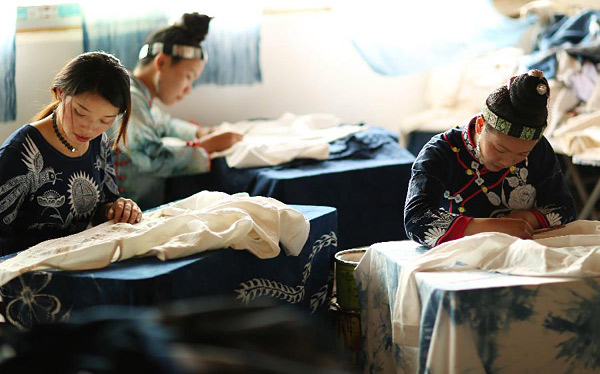 4月9日,在贵州省丹寨县扬武镇排莫村一家蜡染合作社内,蜡染手工艺人在绘制蜡画。近年来,贵州省黔东南苗族侗族自治州丹寨县利用旅游景区,带动传统村寨发展非遗手工经济,开办非遗手工体验馆,让游客近距离感受非遗,走出一条“指尖经济”脱贫之路。据了解,2017年丹寨县实现全县旅游综合收入20.93亿元,带动贫困人口人均增收5365元。