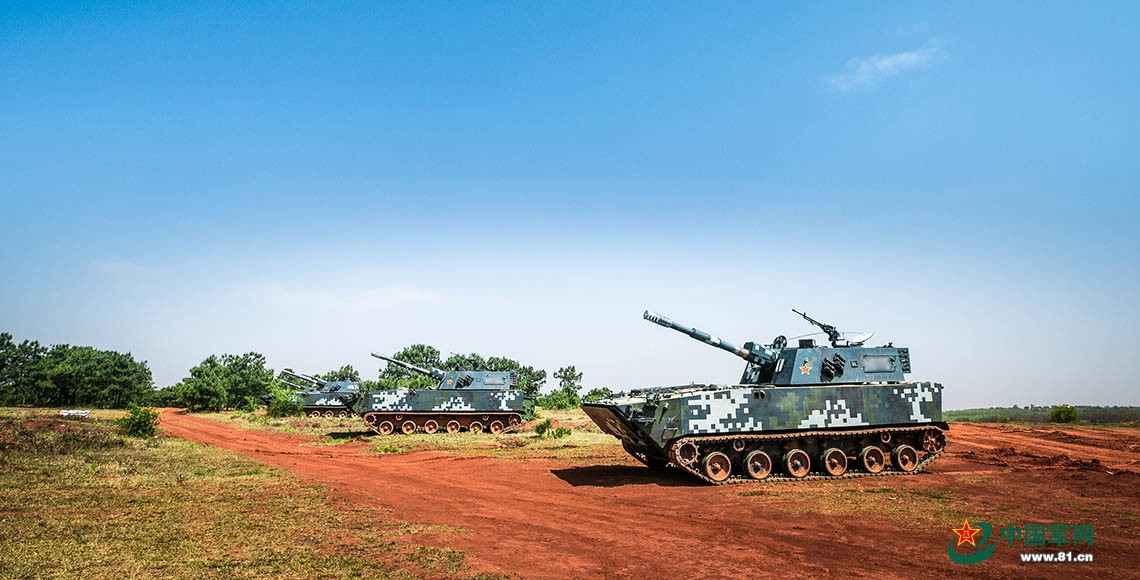 两栖自行榴弹炮占领发射阵地。