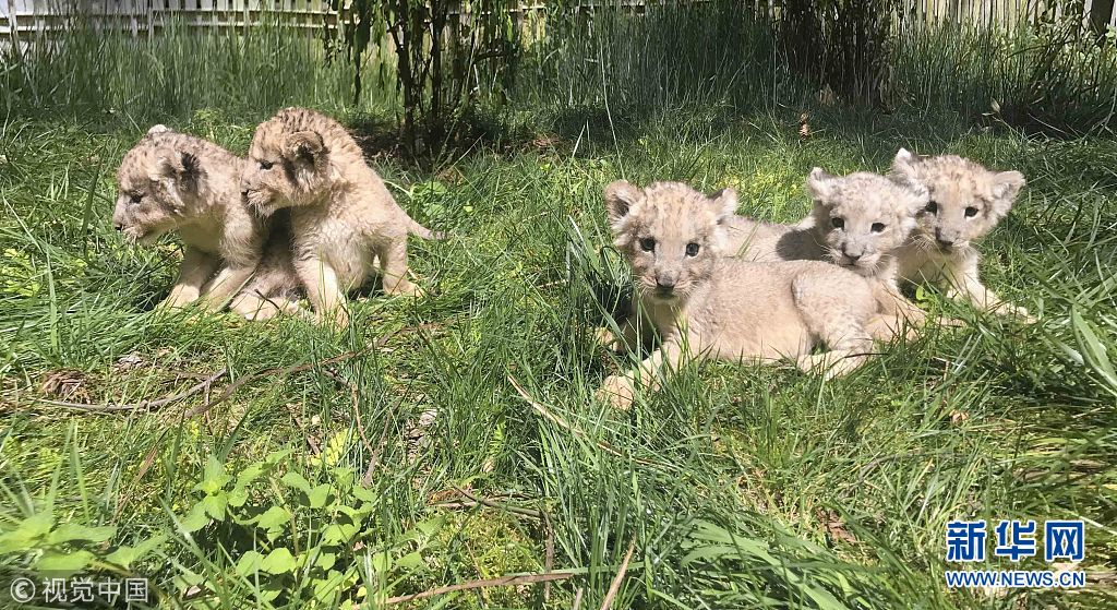 4月17日,在贵州森林野生动物园珍稀动物区,记者见到了5只刚出生的小狮子。5只小非洲狮合影。(图片来源:视觉中国)