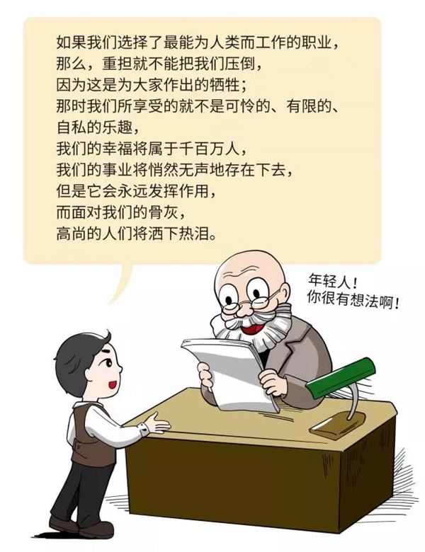 这是非常有名的一段话,从这段话中,我们可以很明显看出,马克思这里的讨论已经远远地超出了世俗的职业范围,他实际上讲的是理想信念和人生志向。